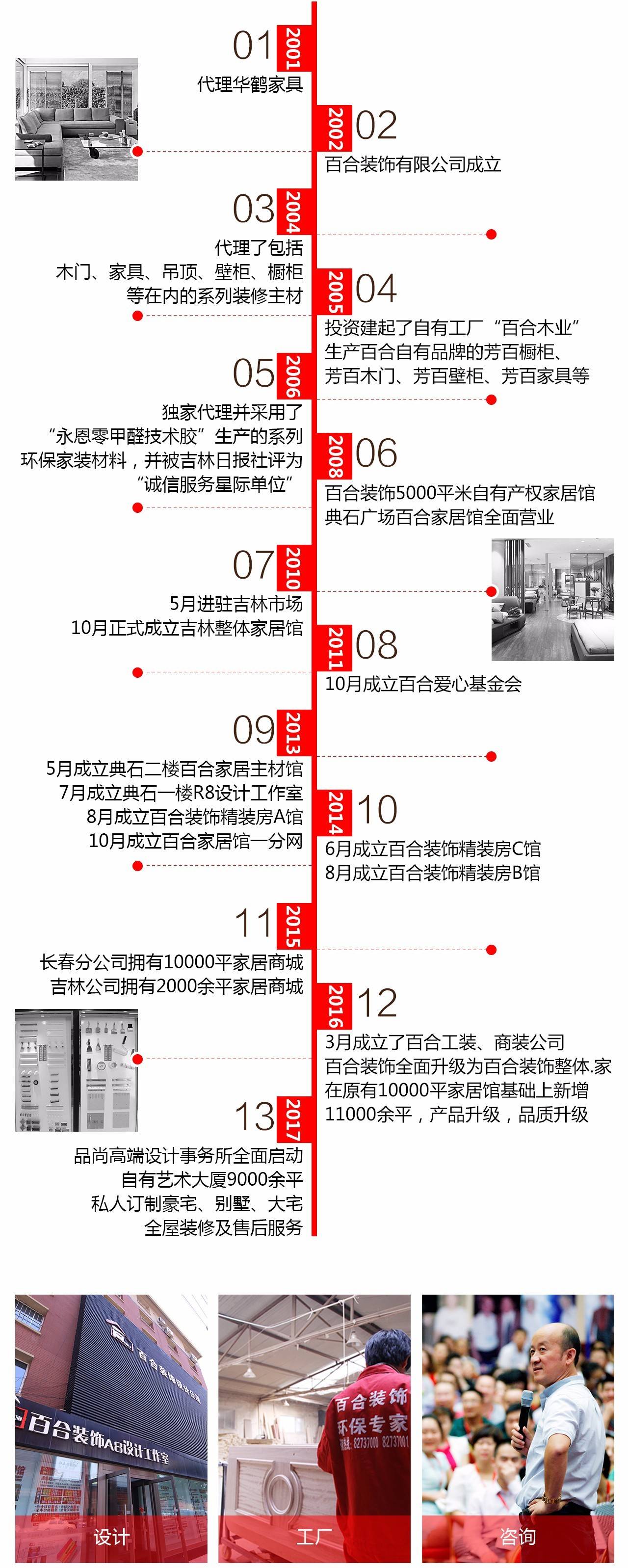 2000年,緣起家具代理,進而挺進裝修行業(yè),重設(shè)計、抓工程,秉承誠信做人、善美做事的宗旨,風(fēng)雨前行25年,現(xiàn)已擁有自主生產(chǎn)工廠、20000余平的家居展館、100余人優(yōu)秀設(shè)計師團隊、吉林及長春主打賣場,同時更形成了慧百咨詢、百合裝飾、芳百自主工廠、慧百影視四大產(chǎn)業(yè)格局。相比最初,或許您看到的是我質(zhì)的變化,但仍有更大的空間需要我去成長,所有朋友,請繼續(xù)見證!百合裝飾以永遠保持開拓進取的精神,不滿足現(xiàn)狀,敢于自我超越,敢于領(lǐng)先同行,只有秉承這樣的生存哲學(xué),公司才能立于不敗之地!奉獻于顧客的事業(yè)、奉獻于員工的成長、奉獻于社會的發(fā)展!以人為本,才能謀求客戶、員工、企業(yè)、社會的共同成功!