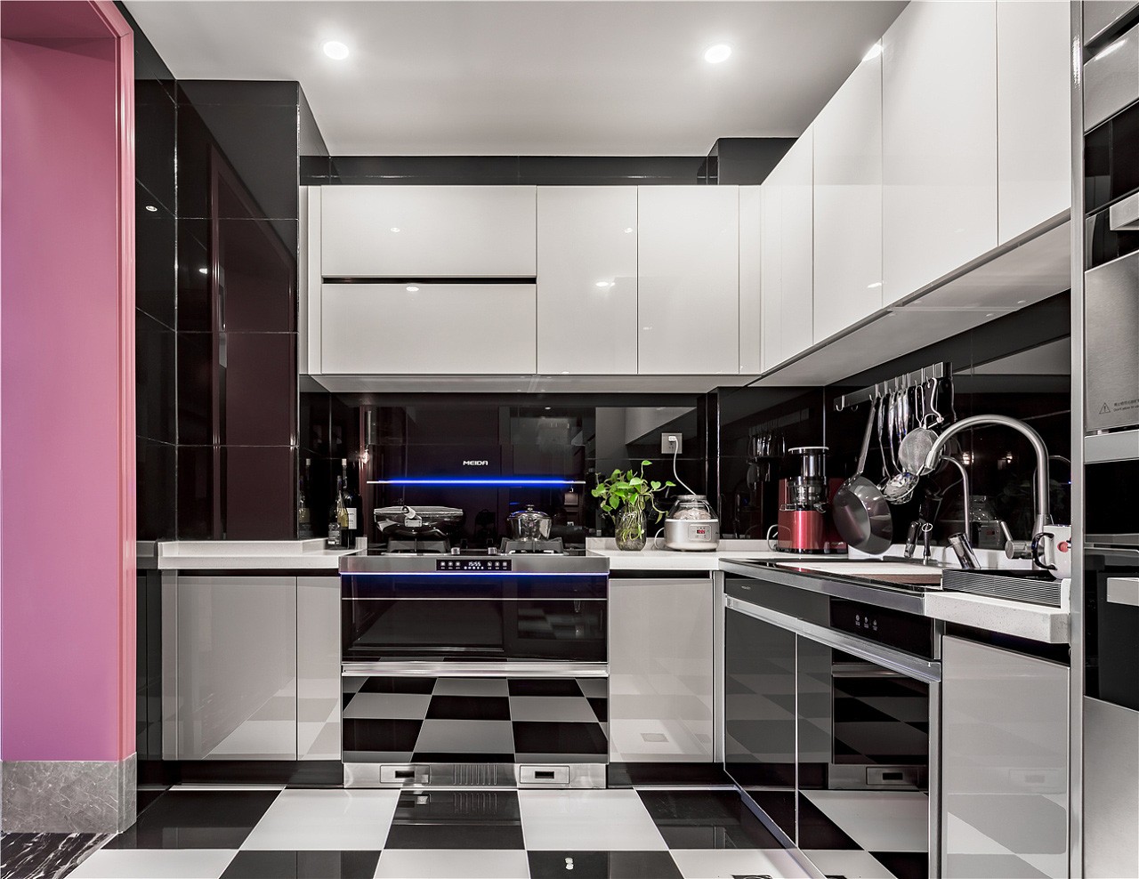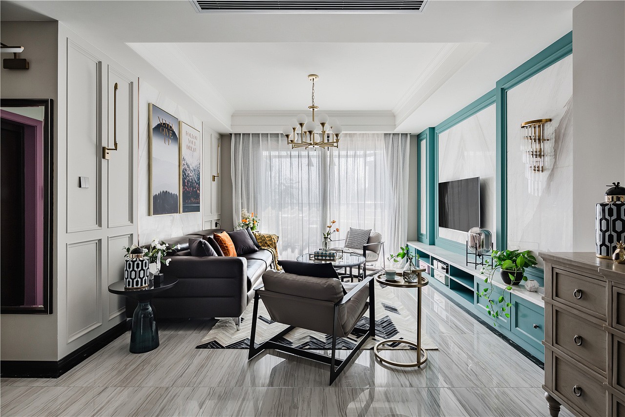入戶門廳以白色作為基調(diào),紫色門套作為點綴,整體空間驚艷脫俗。地板選用更易清洗、更耐磨損的全瓷磚鋪設(shè),大理石貼墻與地面一起,把客餐廳的整體基調(diào)定在了一個雅字上,典雅大氣。深色的皮質(zhì)沙發(fā)把整個客廳的冷色調(diào)提了起來,像一杯香醇的咖啡,迅速捂暖了大理石的冷硬。主臥室淺棕色、黑色、紫色、白色,四大色塊干凈利落的劃分出主臥的空間層次,床頭細(xì)節(jié)的處理使空間更有縱深感。主衛(wèi)生間銀白龍和爵士白的采用與客廳的整體色調(diào)一脈相承,三種切割成不同大小的瓷磚拼接造型,使小小一方天地也能層次分明。