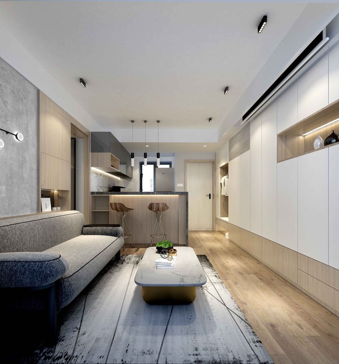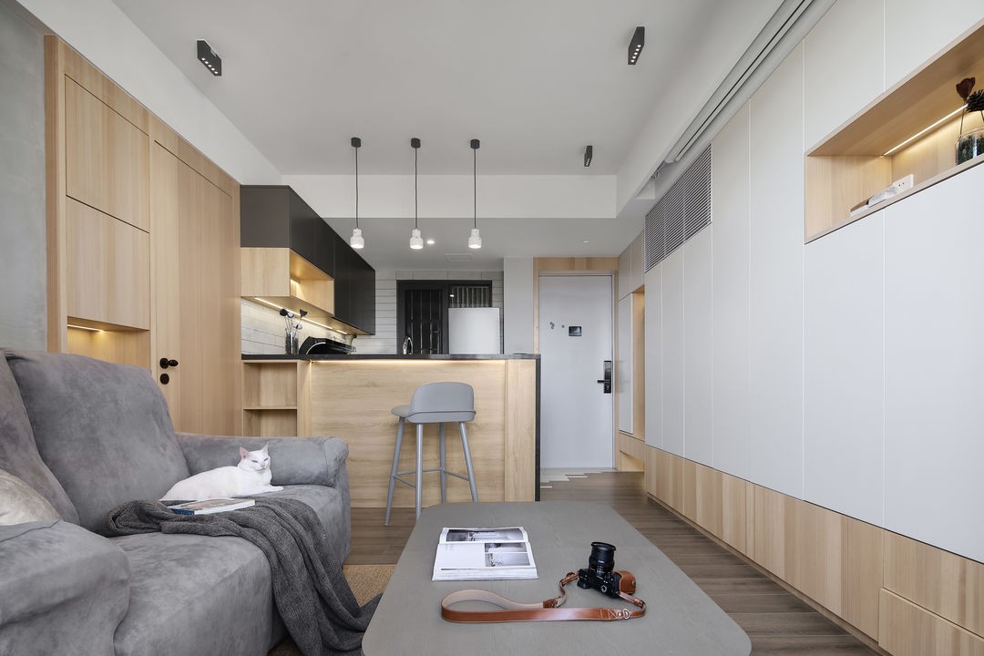 入戶門位置調(diào)整縮小,增加一整面的收納柜,滿足海量收納需求。