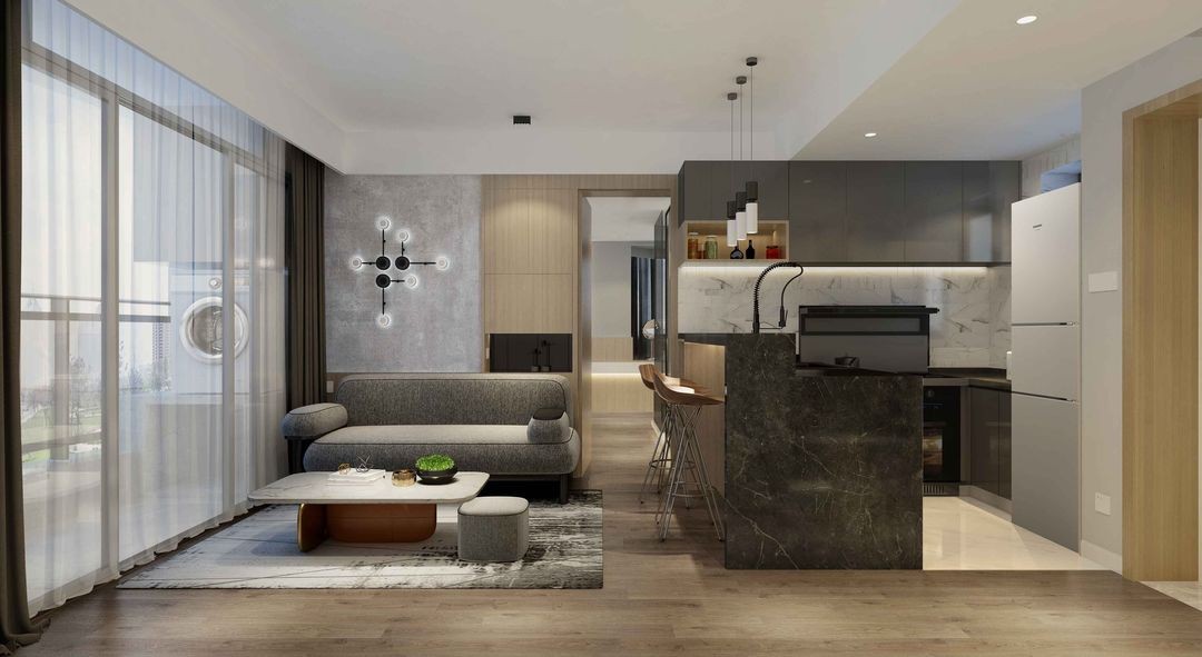 把廚房設(shè)計為開放式,吧臺和餐桌結(jié)合(很少做飯,平時都是點外賣)。