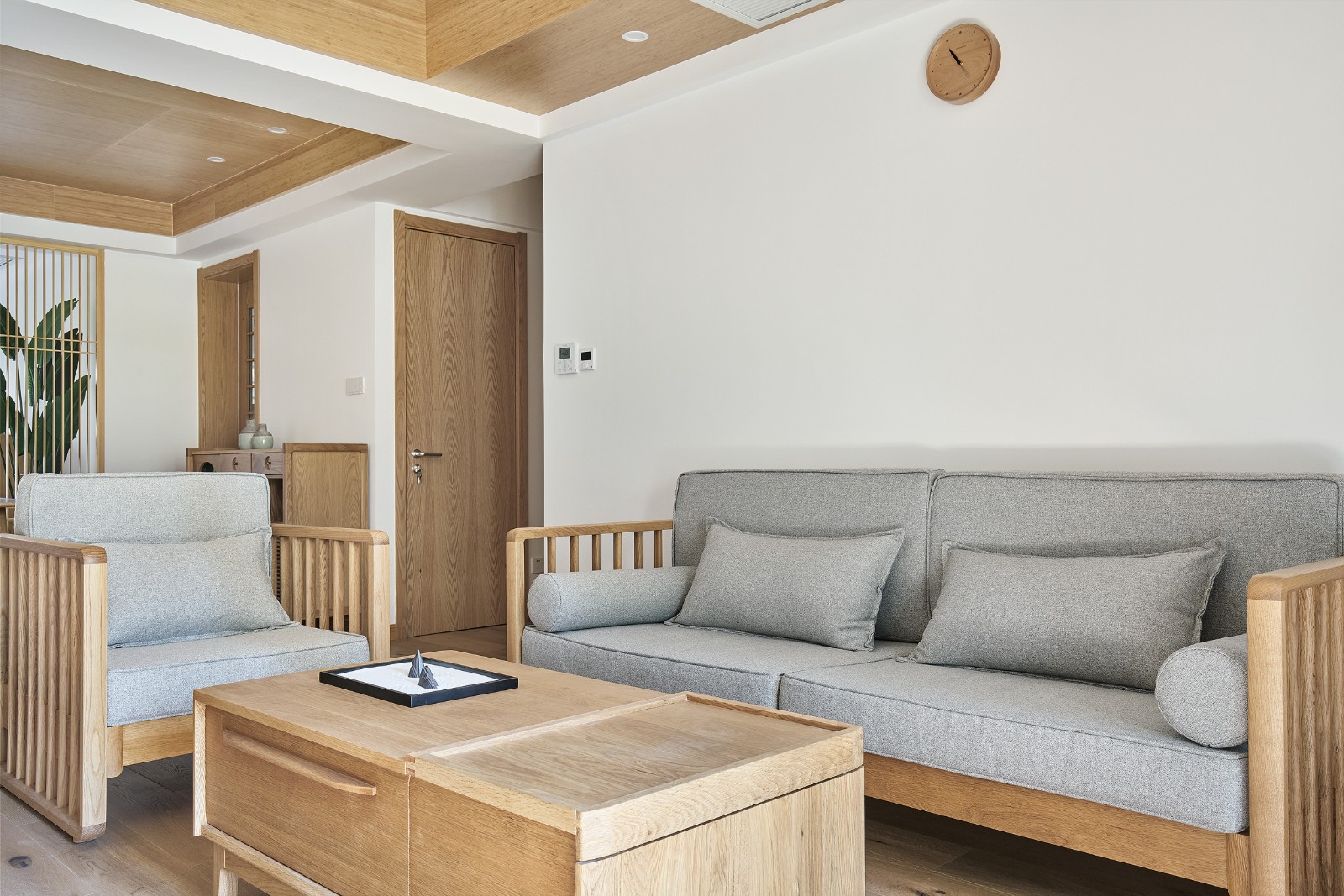 簡單的灰色系布藝沙發(fā),端重卻不失靈動,自然的背景墻掛上實木小時鐘