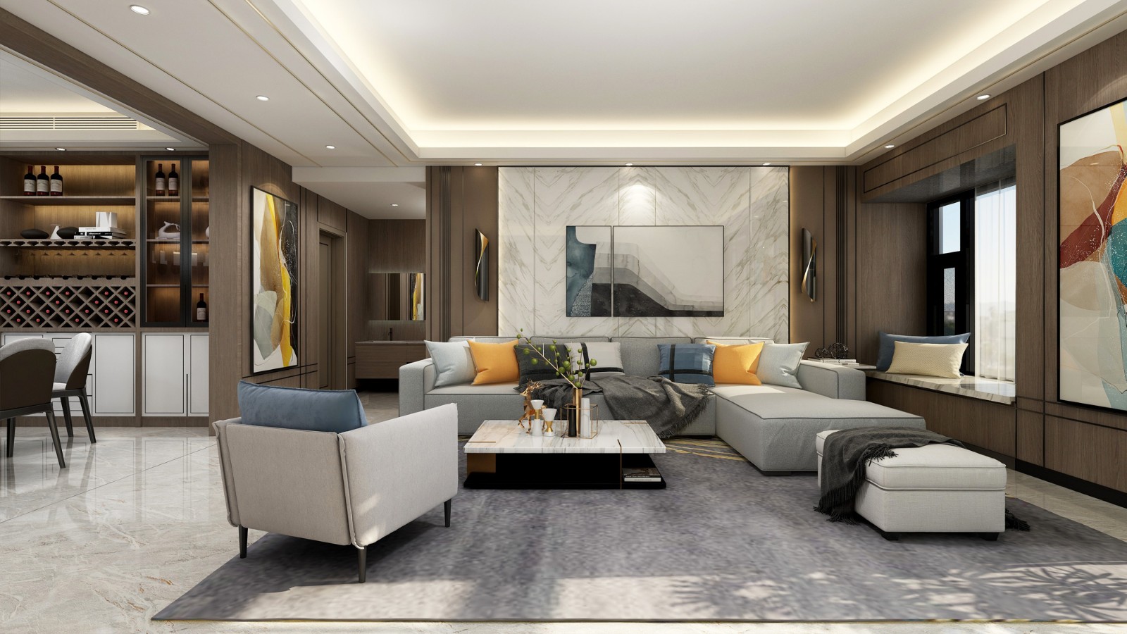 整個(gè)一樓客廳面積比較大,采用無(wú)主燈設(shè)計(jì),巧妙地將燈光設(shè)計(jì)在吊頂之中,是一種低調(diào)的奢華。