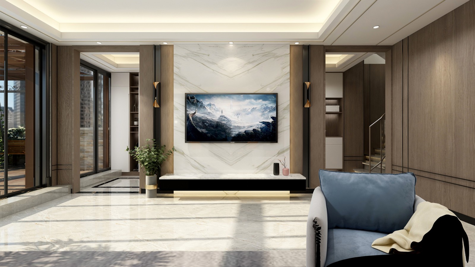 電視背景墻采用滿墻的大理石紋瓷磚,懸空的電視柜,高級(jí)感十足。