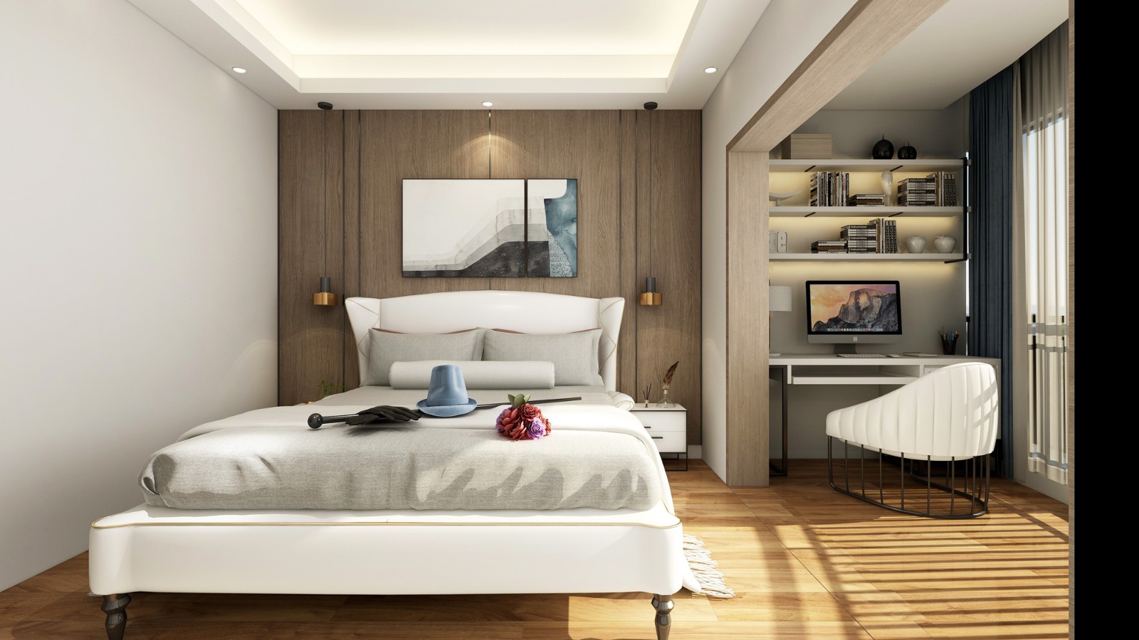 主臥將陽(yáng)臺(tái)打通,在增大的室內(nèi)空間里打造出一個(gè)專屬的工作區(qū)。