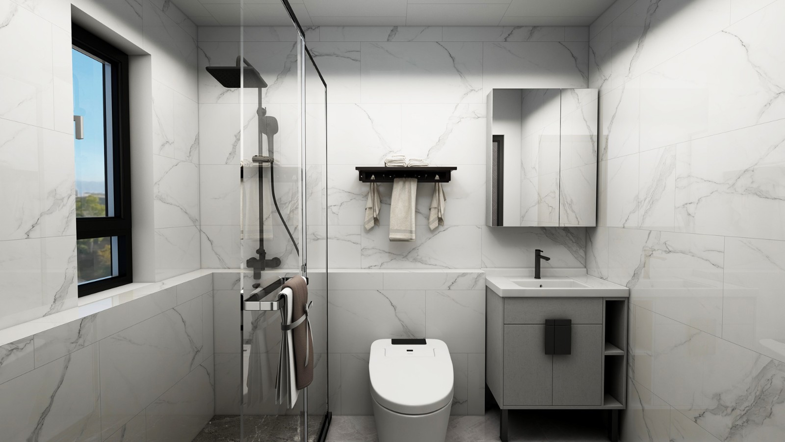 衛(wèi)生間采用二分式隔斷,透明的玻璃隔斷,即使是衛(wèi)生間也不會(huì)顯得十分狹窄。