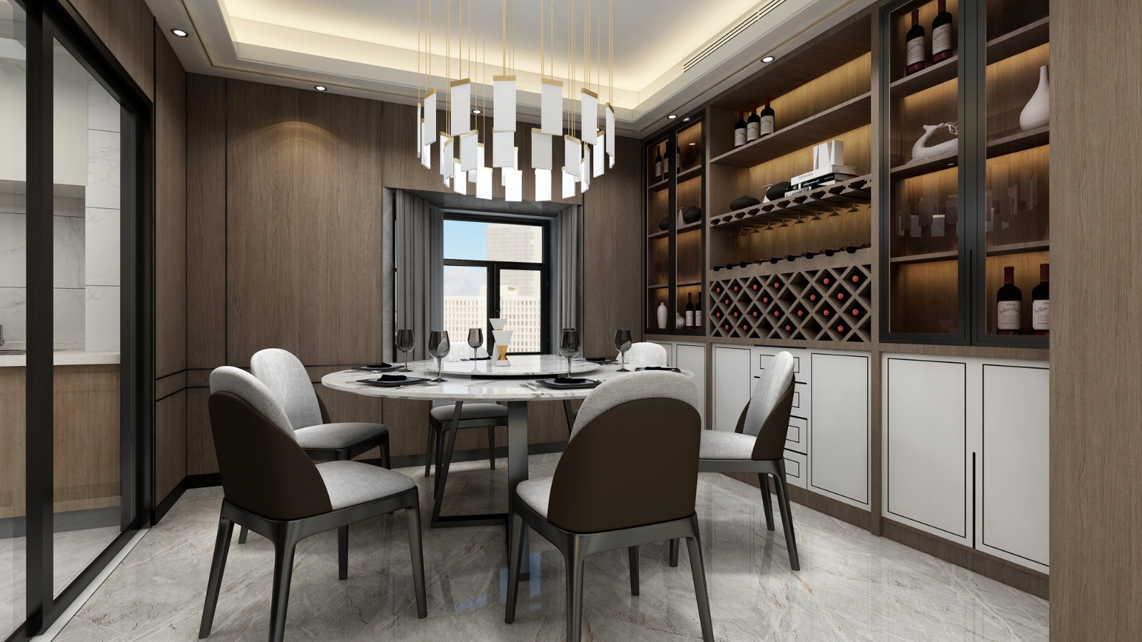反其道而行,在餐廳里設(shè)置一組精致的吊燈,讓一家人就餐的氛圍更加濃烈。