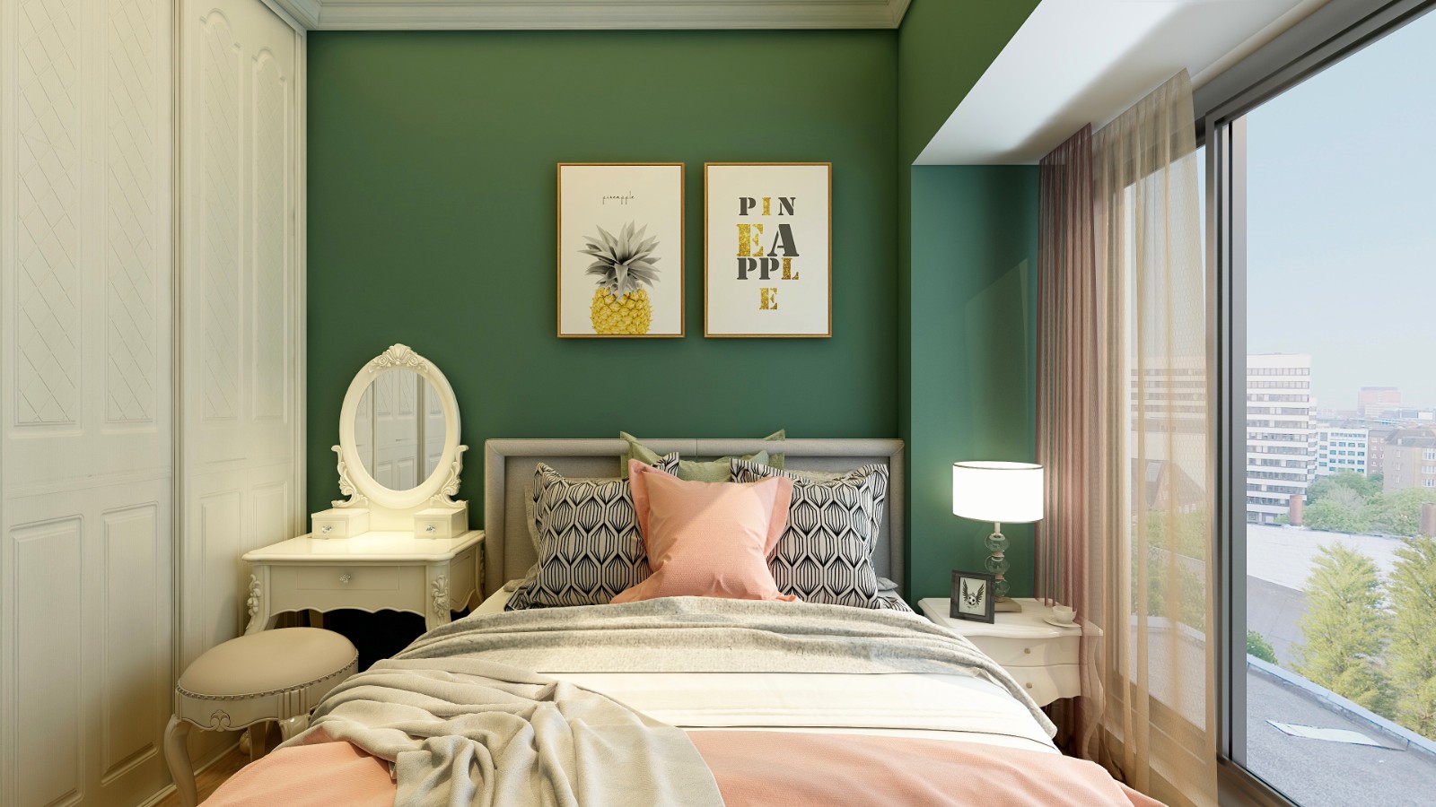 主臥背景墻延續(xù)電視背景墻的墨綠色調(diào),寧?kù)o、閑適、內(nèi)斂,將兩幅黃色系裝飾畫(huà)引入空間,增添一絲活躍氣息。