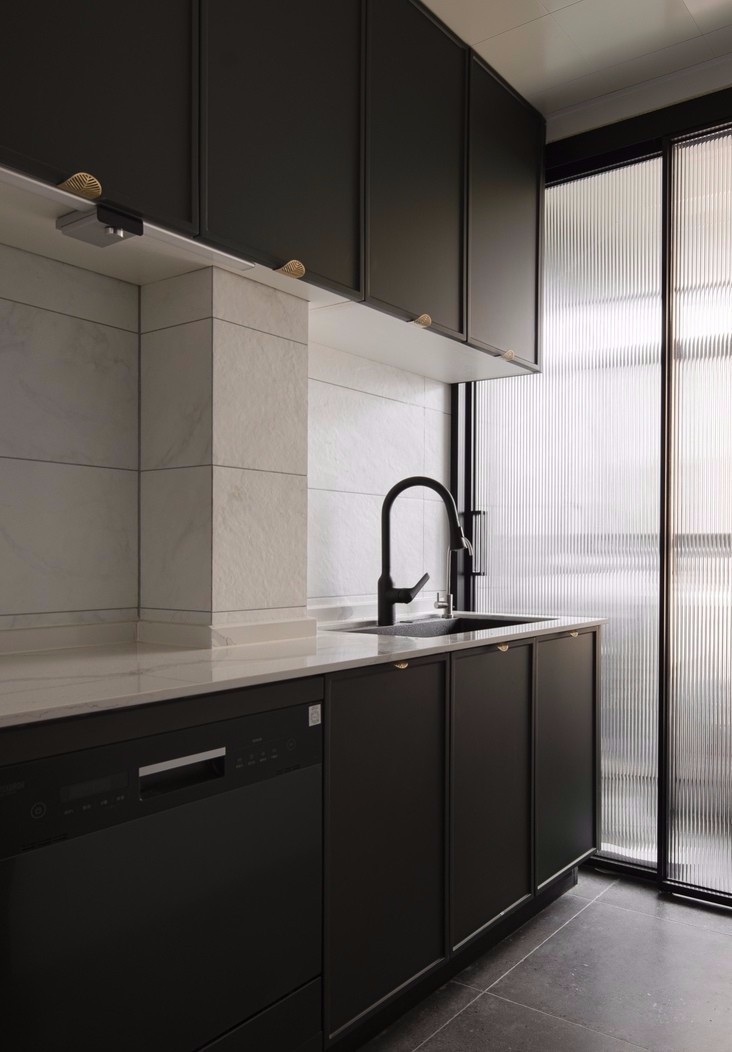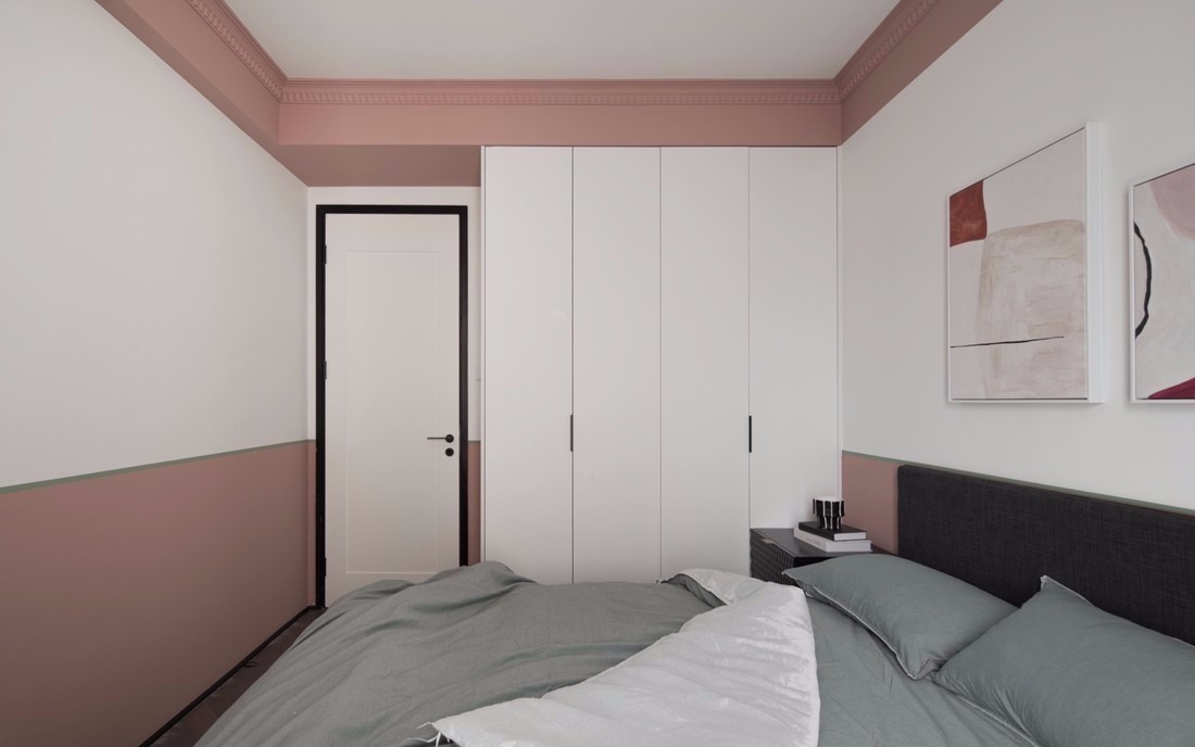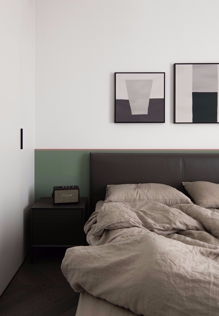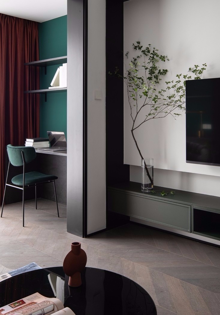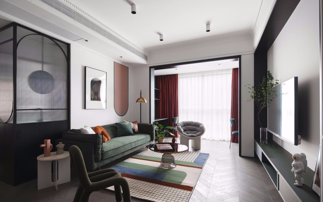 客廳空間以白色為主色調(diào),融入墨綠、酒紅、臟粉等低飽和度彩色,為空間增添了繽紛、動(dòng)感的視覺(jué)效果。