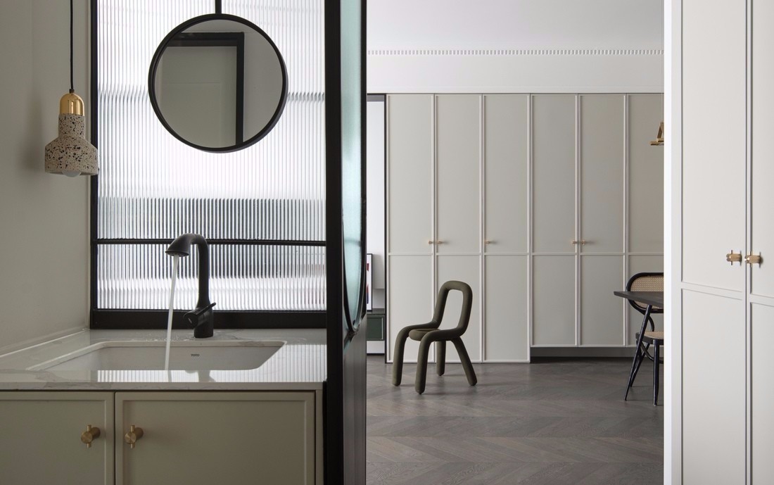 由客廳望向餐廳。客餐廳公共空間以白色為主色調(diào),點(diǎn)綴貫穿全屋的粉和綠。餐邊柜旁的門神,守護(hù)陪伴著一家三口,也為這個(gè)家注入了更多年輕活潑的元素。