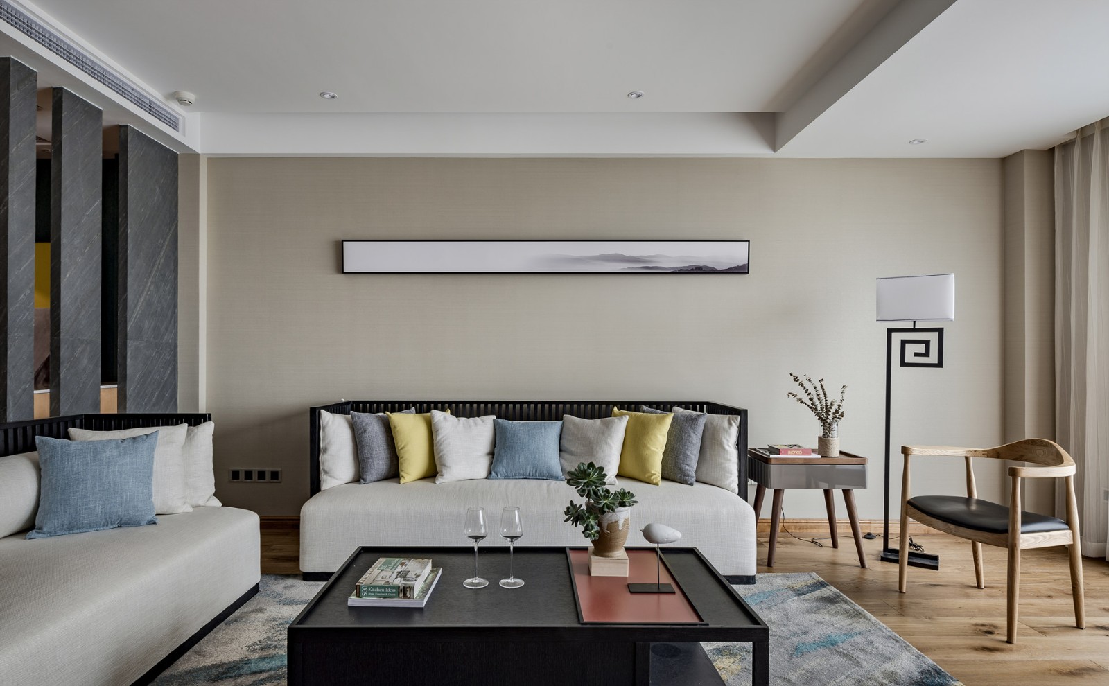 沙發(fā)背景墻珍珠白乳膠漆,新中式特有的落地燈,簡單的一副山水掛畫就能體現(xiàn)業(yè)主的品味。