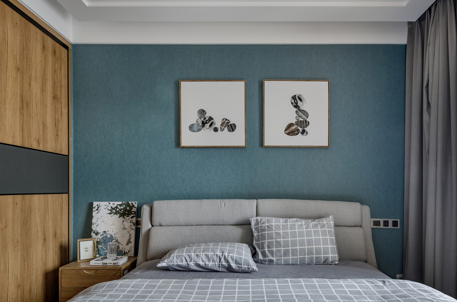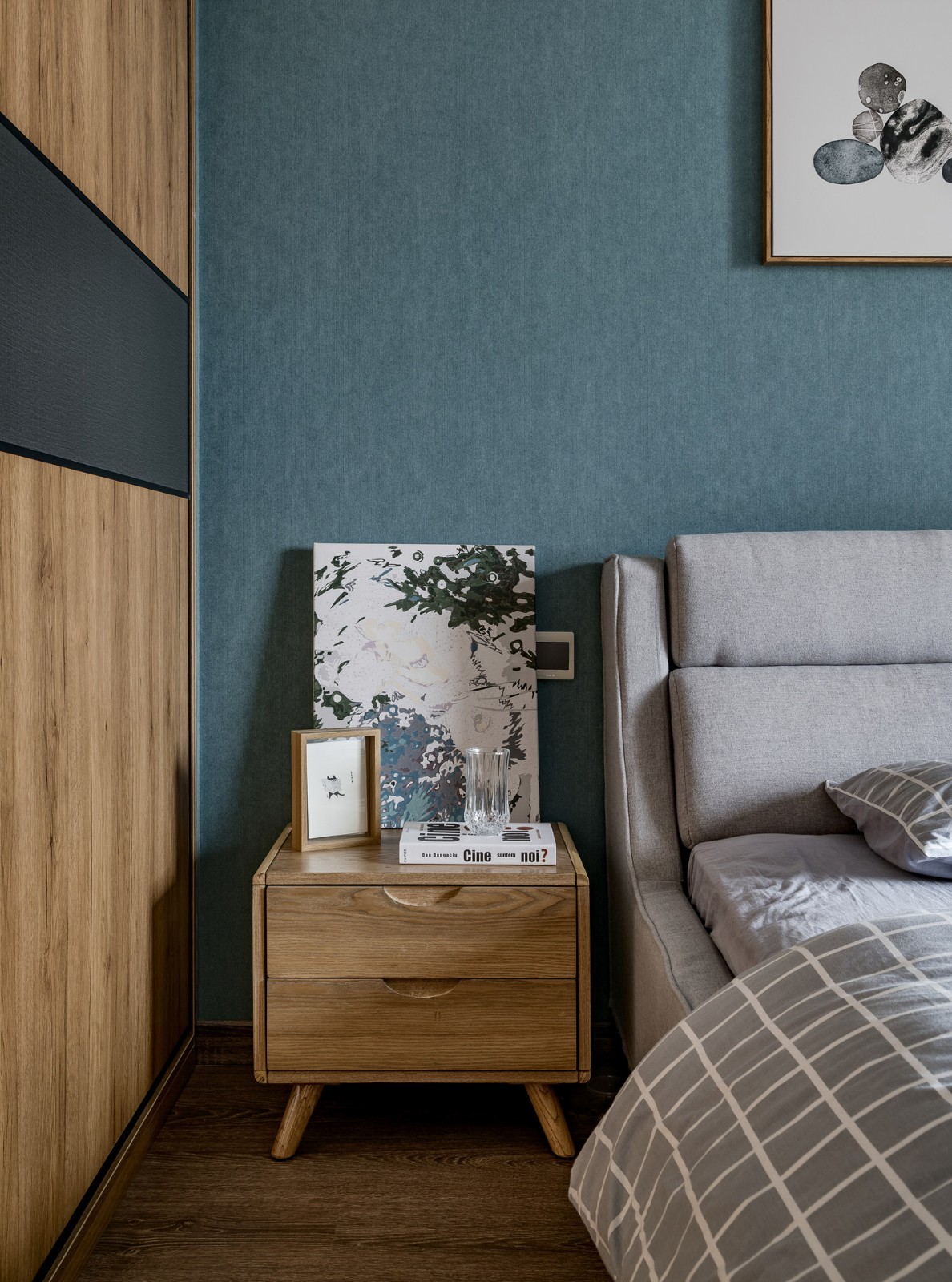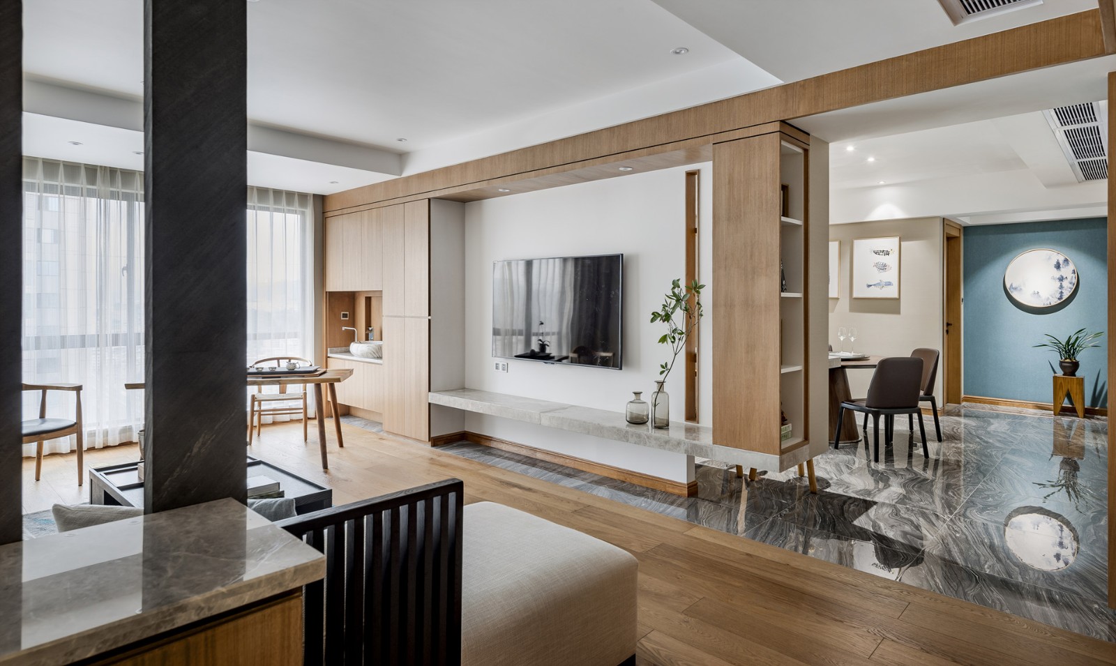 電視背景墻采用原木、大理石、乳膠漆加一點綠植,返璞歸真的生活感受。